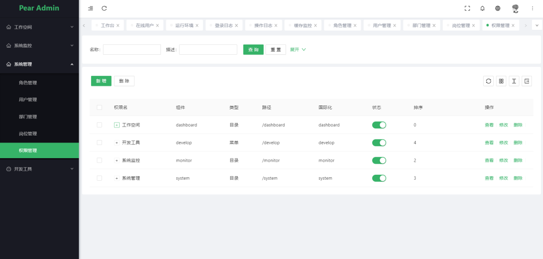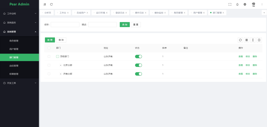 部门管理: 配置系统组织机构(公司、部门、小组),树结构展现支持数据权限。 -
