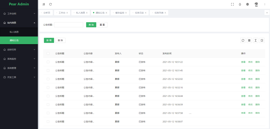 通知公告: 系统通知公告信息发布维护。 -