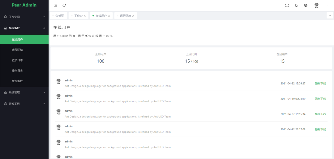 在线用户: 用户在线列表,用于系统在线用户监控。 -