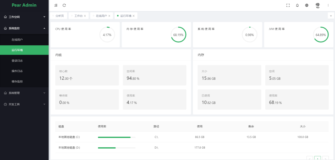 运行环境: 监视当前系统CPU、内存、磁盘、堆栈等相关信息。 -