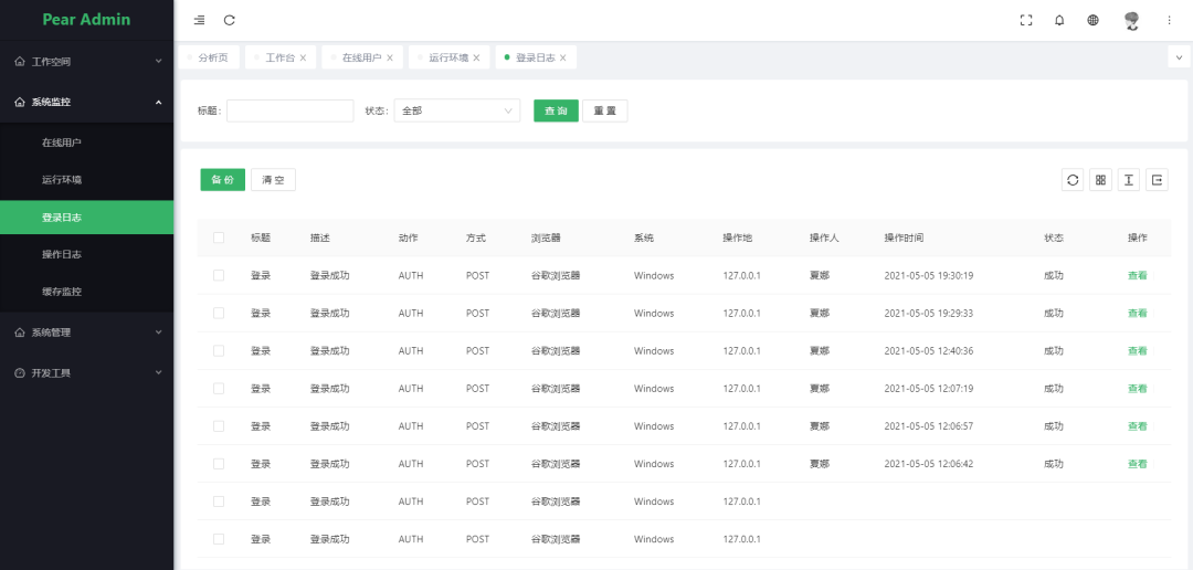 登录日志: 系统登录日志记录查询包含登录异常。 -