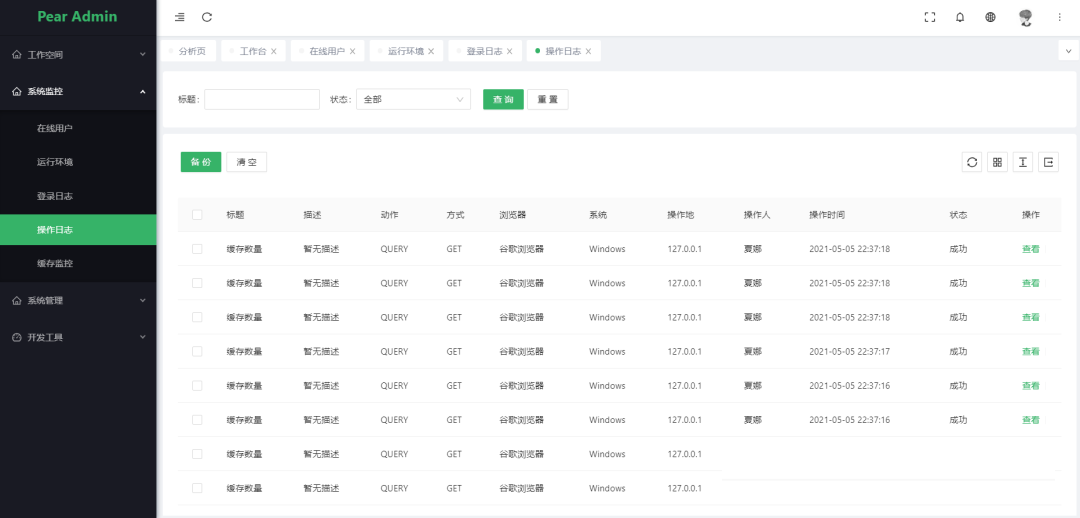 操作日志: 系统正常操作日志记录和查询;系统异常信息日志记录和查询。 -