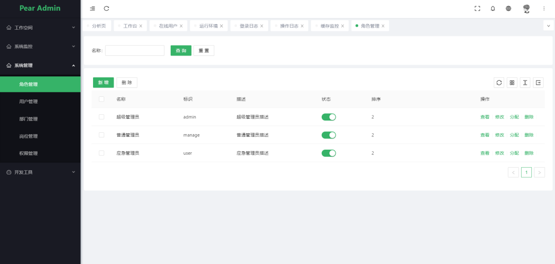 角色管理: 角色菜单权限分配、设置角色按机构进行数据范围权限划分。 -