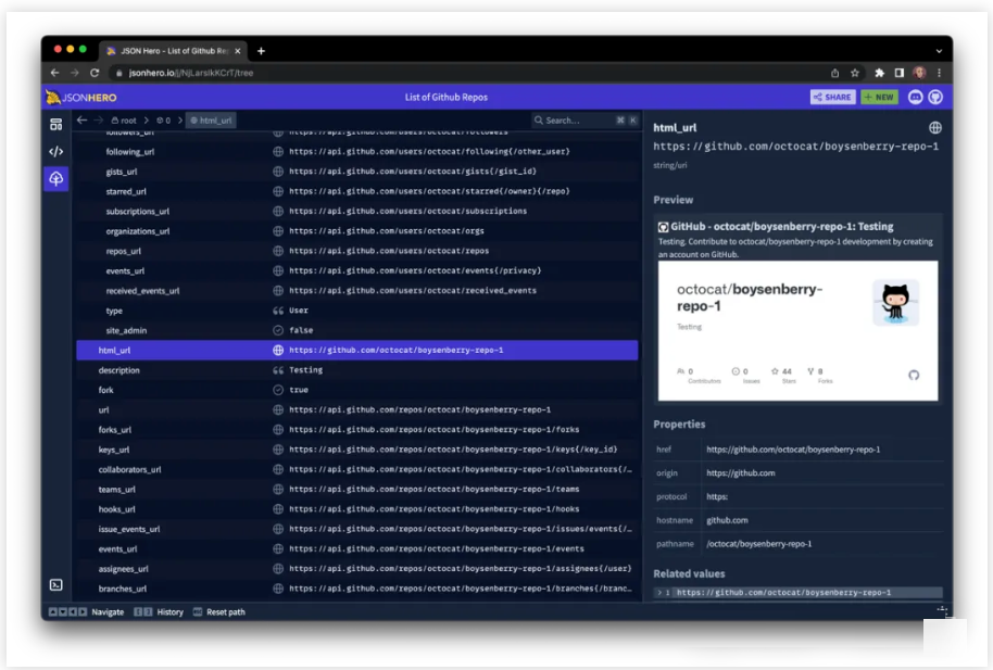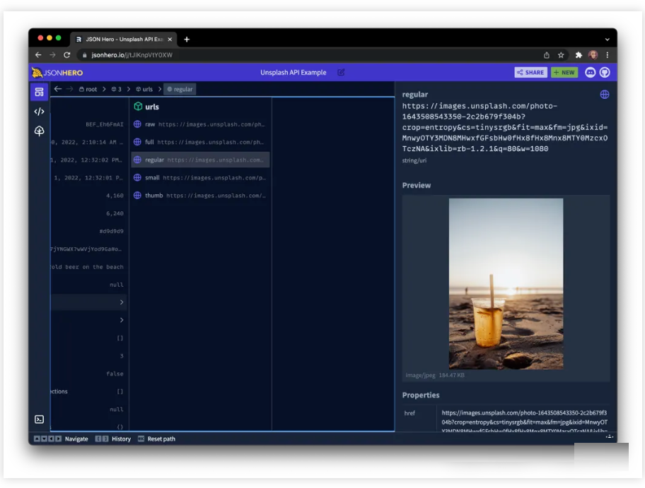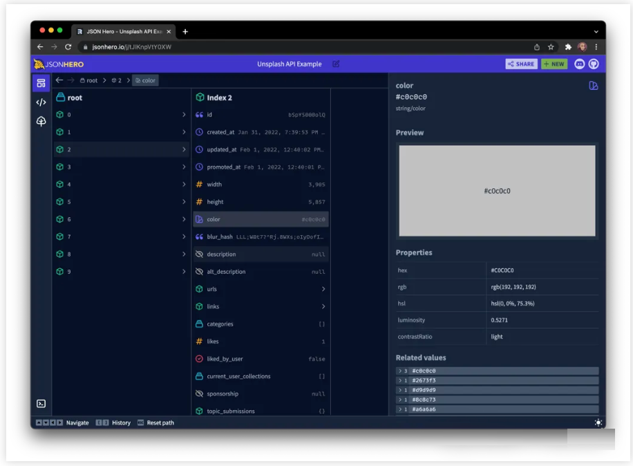 JSON Hero 会自动推断字符串的内容,并对选择的值提供有用的预览和属性。