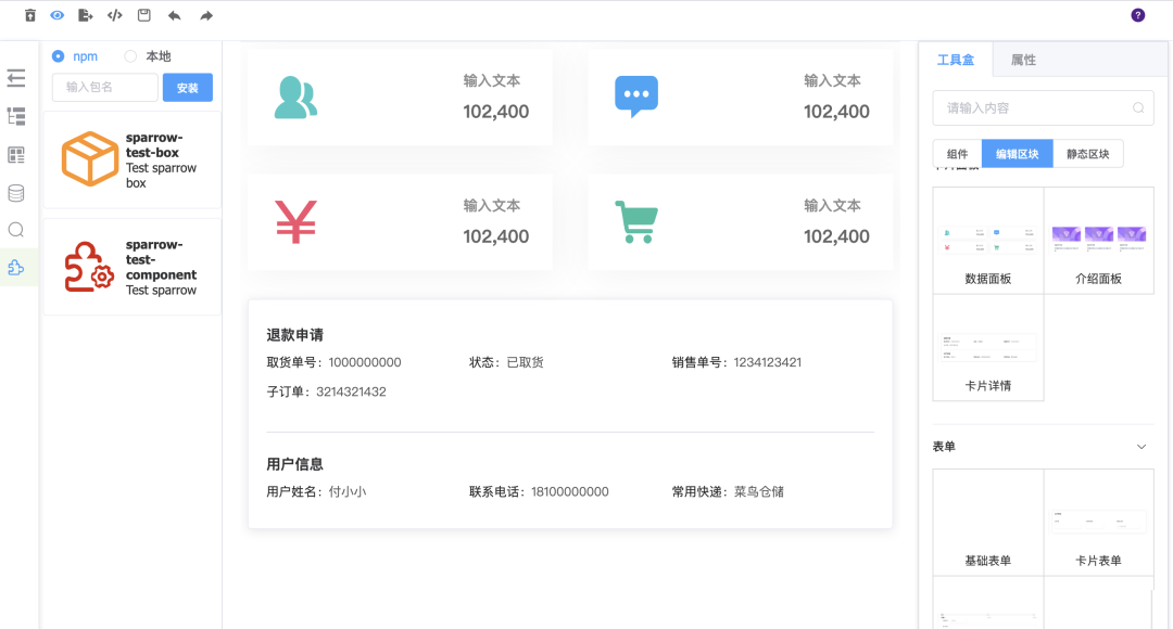 Sparrow 是一套场景化低代码搭建页面的工作台,通过预置组件简单拖拉拽就能快速搭建页面,制作完毕后即可在线调试即时体验,实时修改,页面效果所见即所得,并且支持生成源代码。