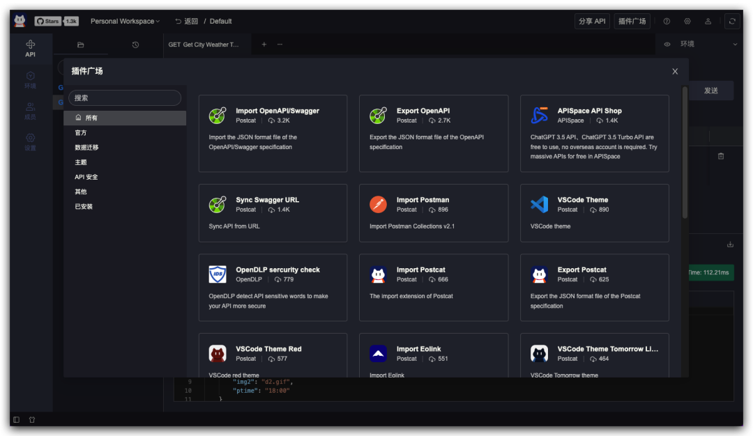 我们在保证 Postcat 轻巧灵活的同时,还为它设计了一个强大的插件系统,让您可以一键使用插件来增强它的功能。