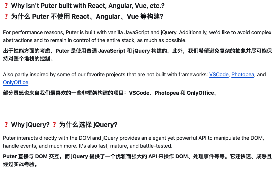 他说道:“Puter 直接与 DOM 进行交互,jQuery 为操作 DOM、处理事件等提供了优雅且强大的 API,并且这是一个快速、成熟且经过实战考验的框架。”