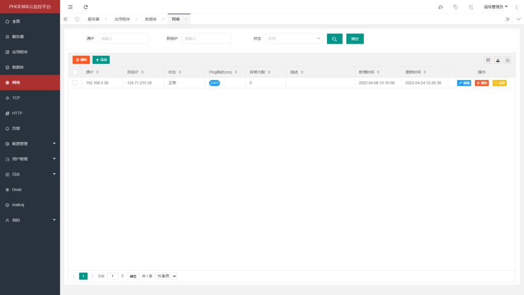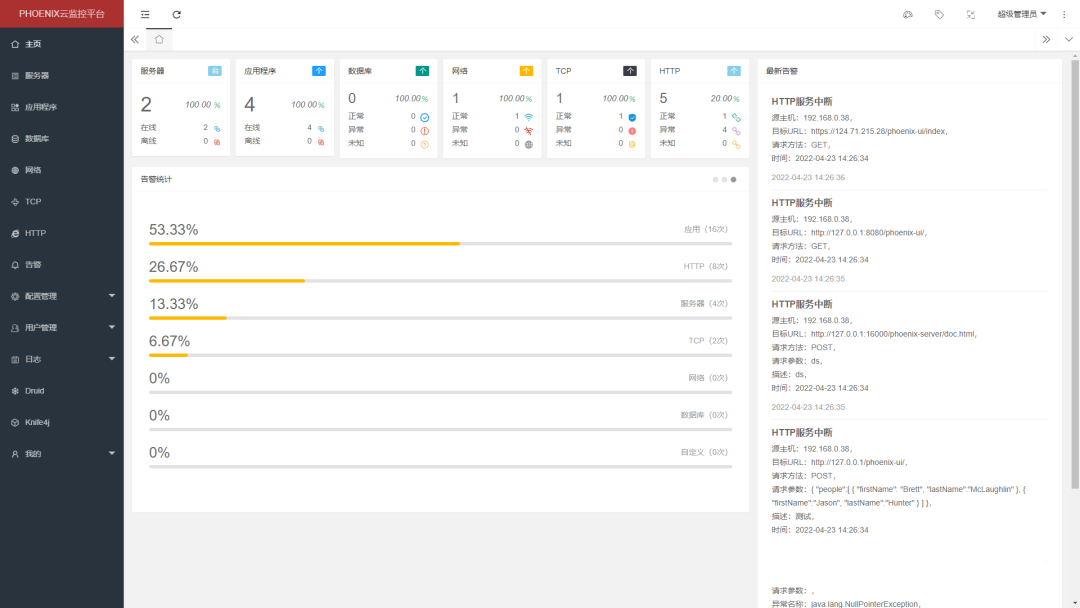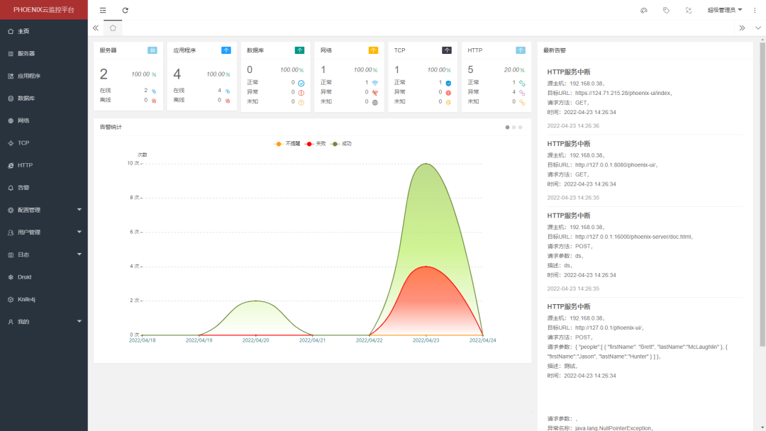 “phoenix” 是一个灵活可配置的监控平台,主要用于监控应用程序、服务器、docker、数据库、网络、tcp端口和http接口,通过实时收集、汇聚和分析监控信息,实现在发现异常时立刻推送告警信息,并且提供了可视化系统进行配置、管理、查看。