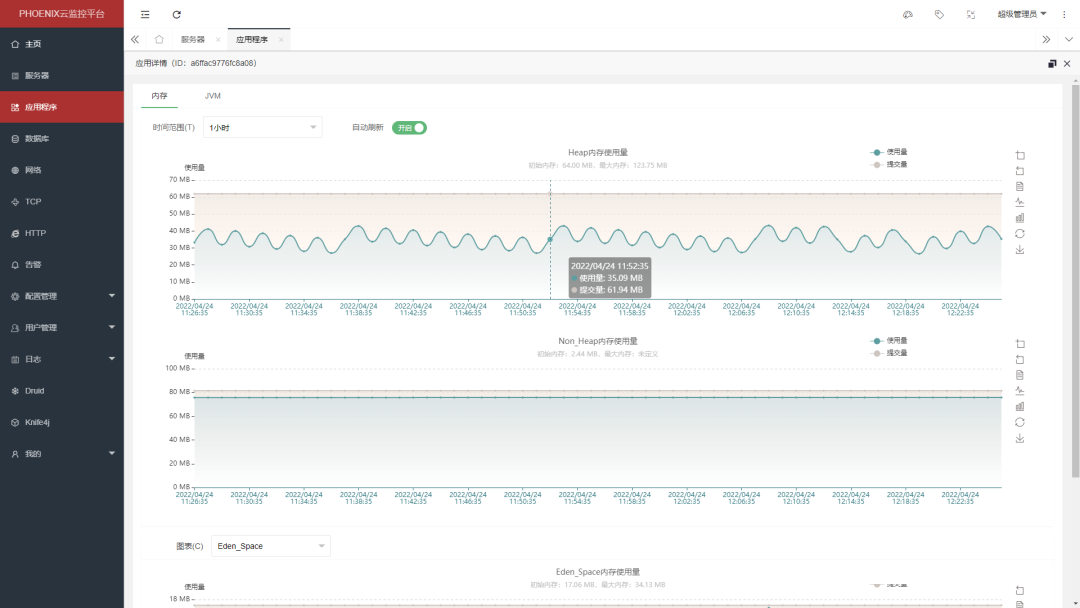 默认支持Java应用程序,监控内容包括:在线状态、JVM(内存、线程、类、GC等)、业务埋点。其它应用程序需要自己开发客户端,来调用接口与服务端或者代理端通信(心跳接口、服务器信息接口、告警接口);