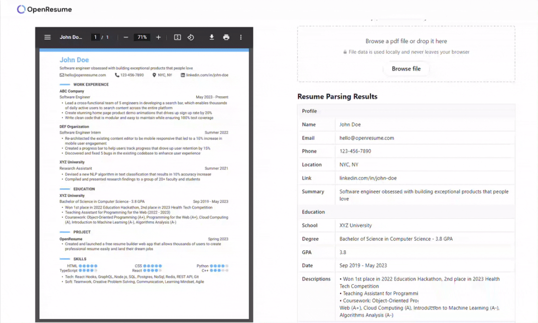 OpenResume 的第二个组件是简历解析器。对于那些已有简历的人来说,简历解析器可以帮助测试和确认其 ATS 可读性。
