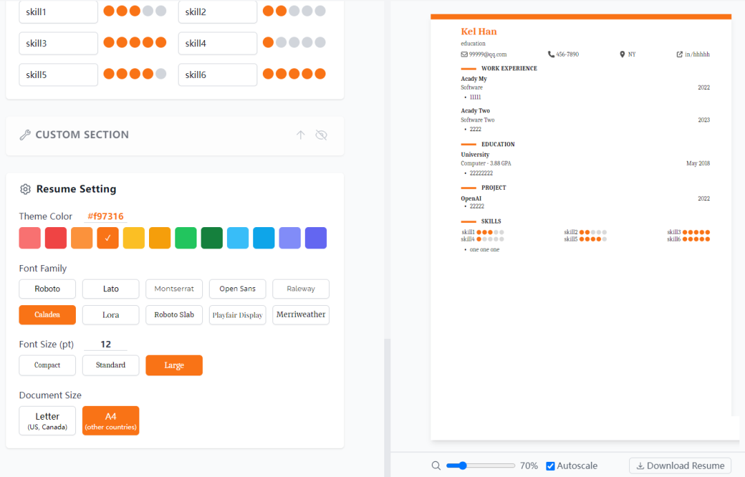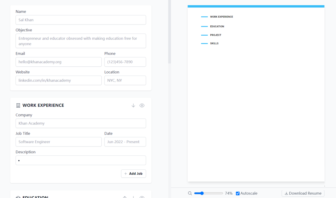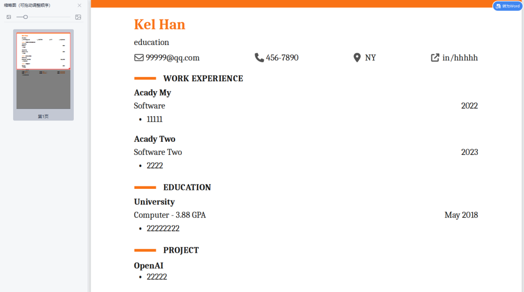「实时UI更新」:当输入简历信息时,简历 PDF 会实时更新,因此可以轻松查看最终输出。