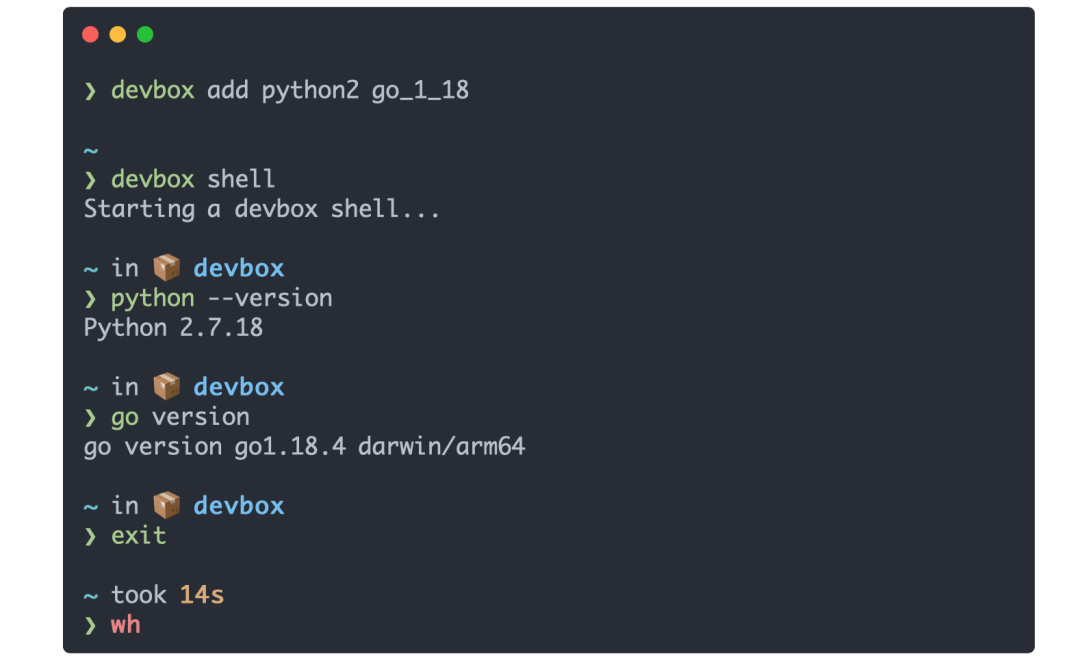 使用 devbox shell 即可进入刚才定义的环境,进入后查看 python --version 可以看到是刚才定义的版本。