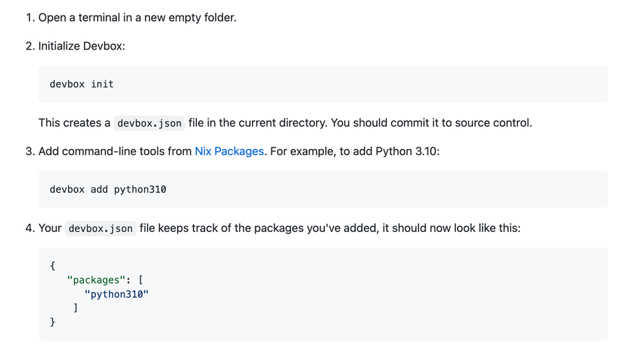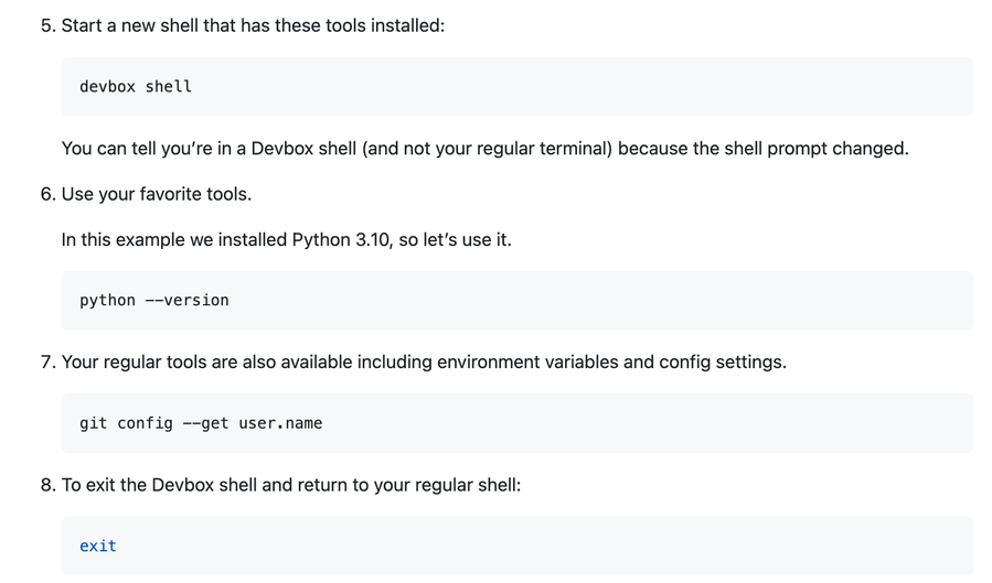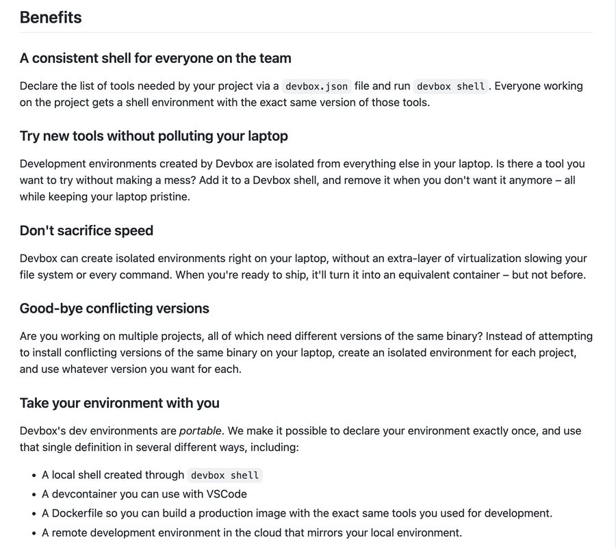 在本地电脑上通过 devbox 来管理依赖的工具有很多的好处,比如可以保证团队内使用统一的开发环境、使用更新的工具版本时可以不污染当前的环境、devbox 相比其他工具安装会更快速。以下是官方整理的使用 devbox 的优点: