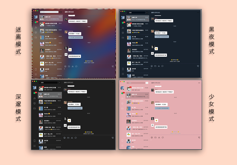• 在皮肤模式下,未读消息头像会轻微可爱摇动,未读数超过 99 条的会话有彩蛋;