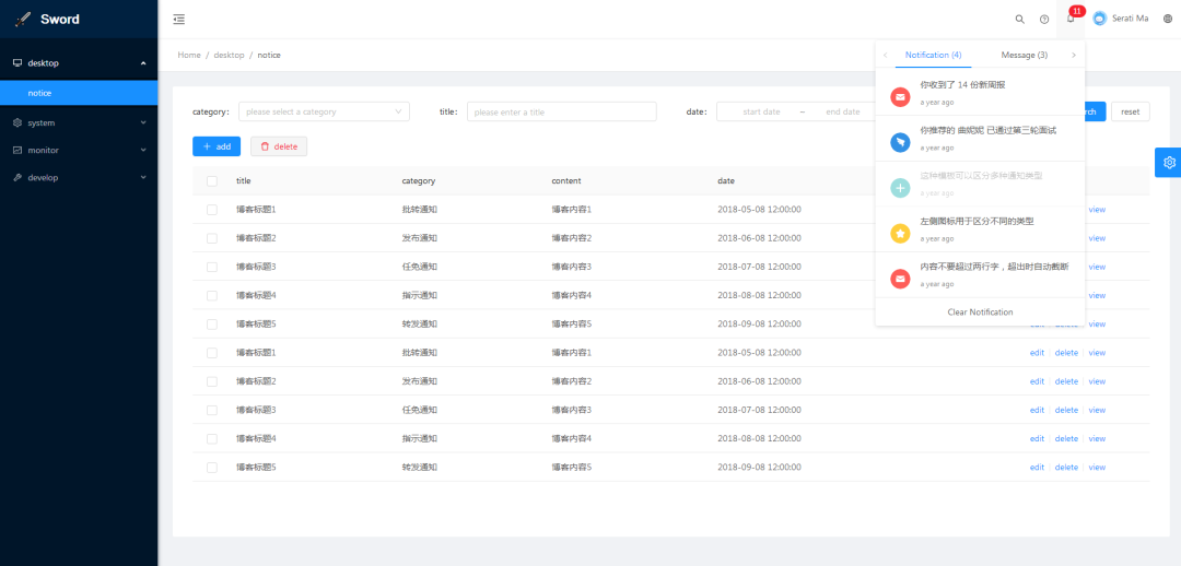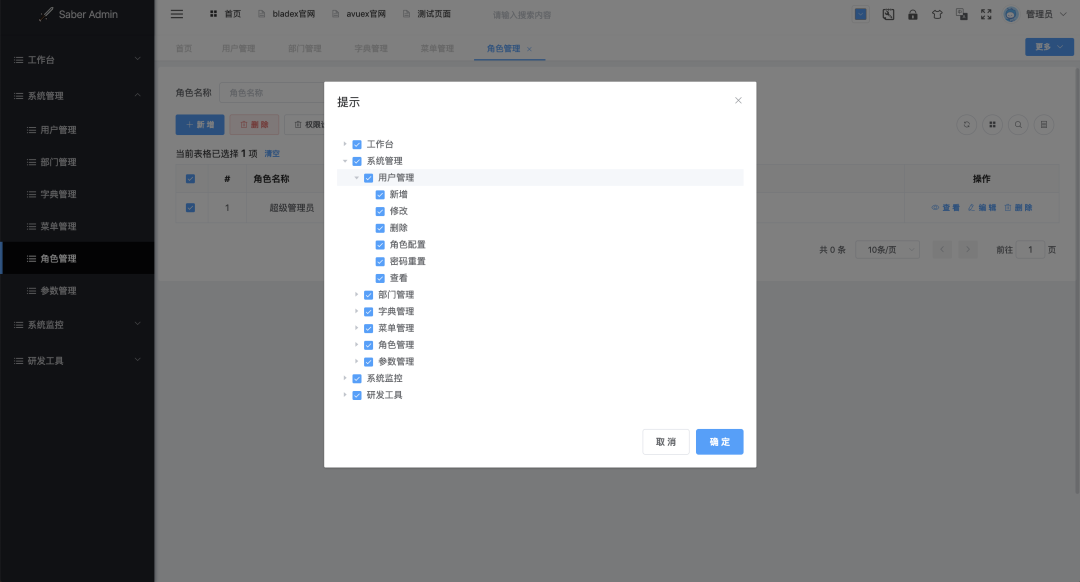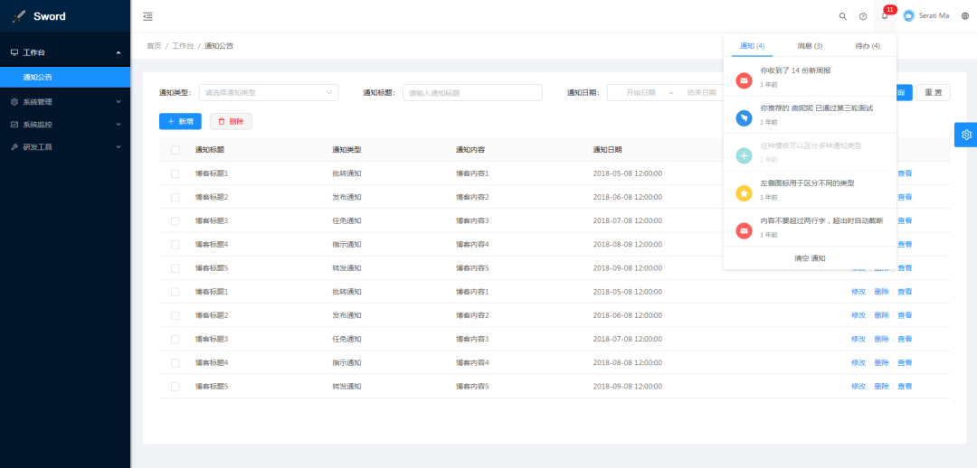 采用前后端分离的模式,前端两个框架:Sword (基于 React、Ant Design)、Saber (基于 Vue、Element-UI) -