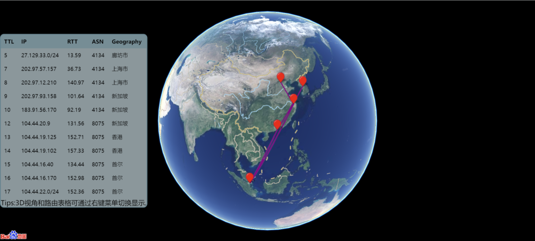不过话说,这种图看上去很清晰,一目了然。在该页面下右键还有放大、缩小地图比例、显示或隐藏路由表以及支持生成二维码,通过手机扫描进行查看。当然了,左侧的路由表显示也并不是全部所追踪到的路由信息,还请以命令行输出的结果为准。