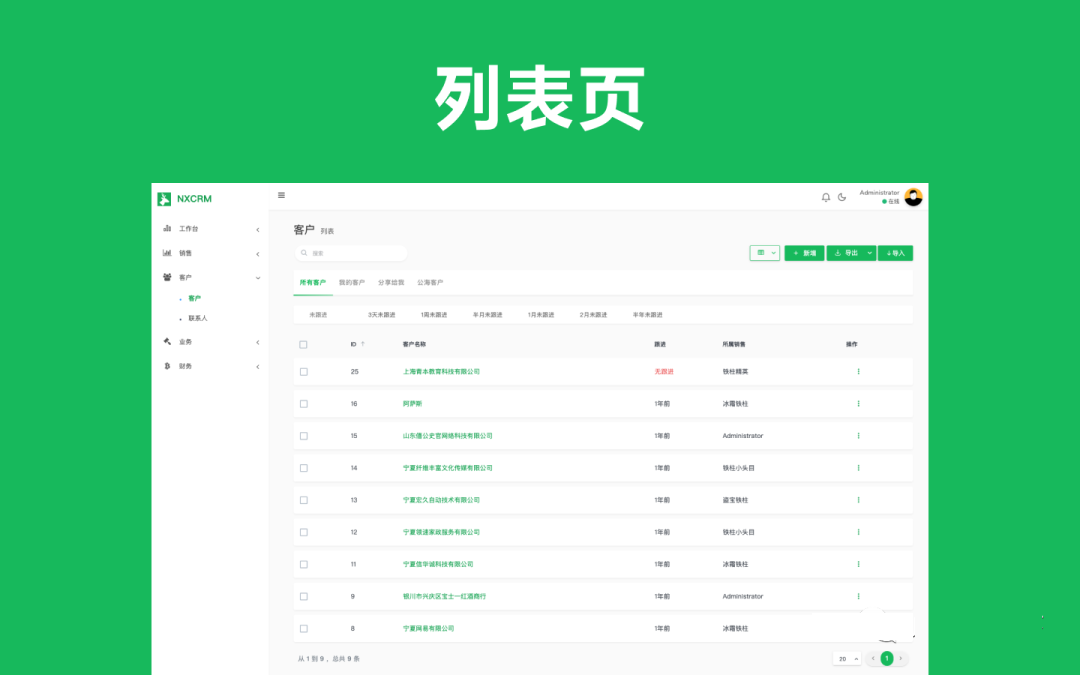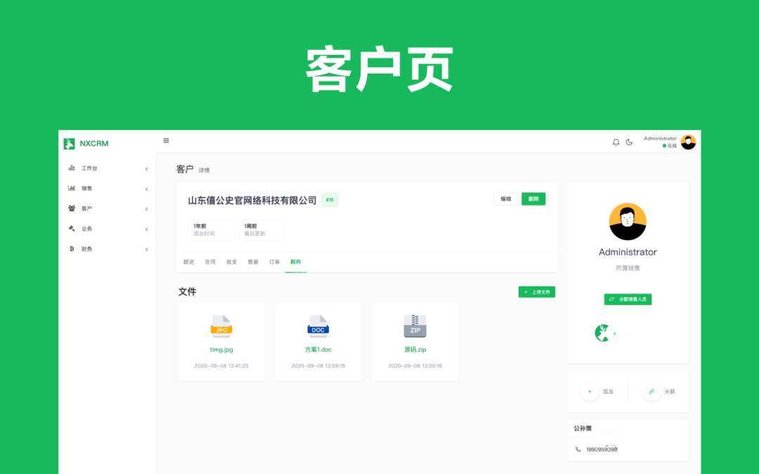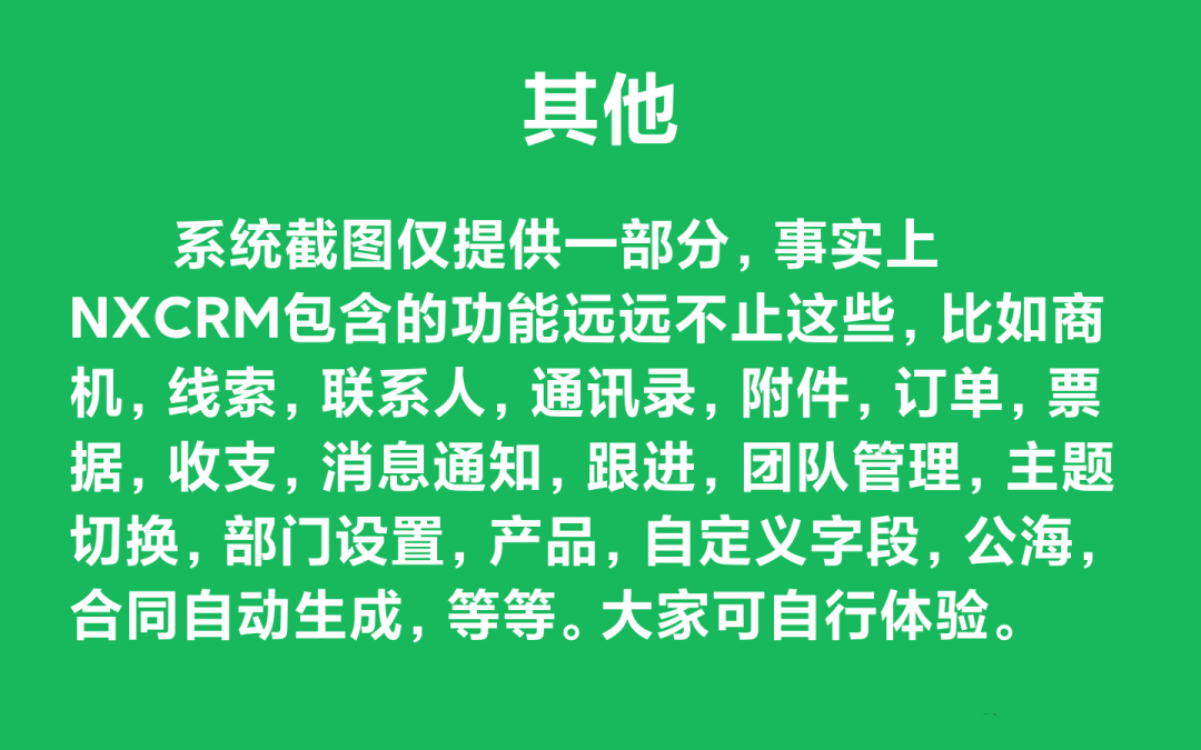 NXCRM 是一套基于 Laravel 的 CRM 应用程序。它包含了一个管理中心,可以管理用户、客户、产品、订单、商机,合同,收款,附件,联系人,跟进动态,发票,业绩目标,团队管理,消息通知等等。