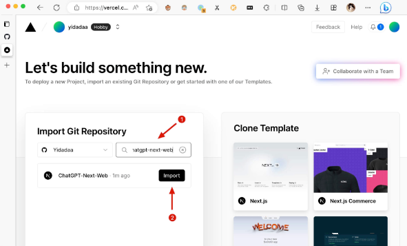 在 Import Git Repository处,搜索chatgpt-next-web; -