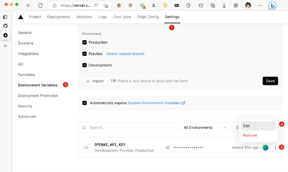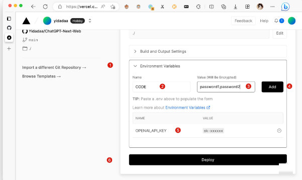 准备好你的 OpenAI API Key,进入 https://vercel.com/new开始部署: