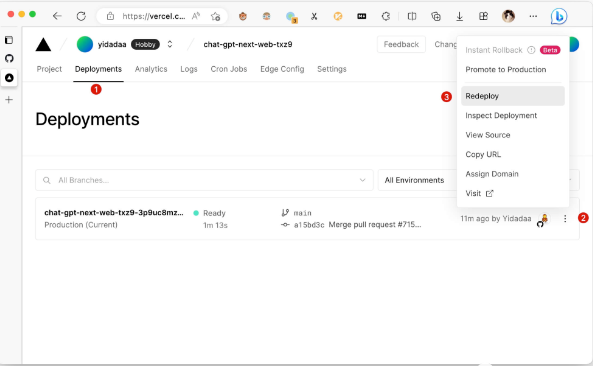 点击 Redeploy 即可重新部署。