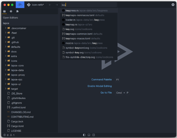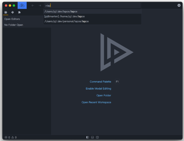 Lapce 有一个命令面板,并支持模糊搜索所需的命令。在 macOS 上按 Cmd+Shift+P,或在 Linux和 Windows 上按 Ctrl+Shift+P 打开。