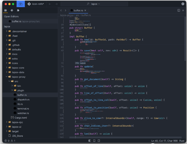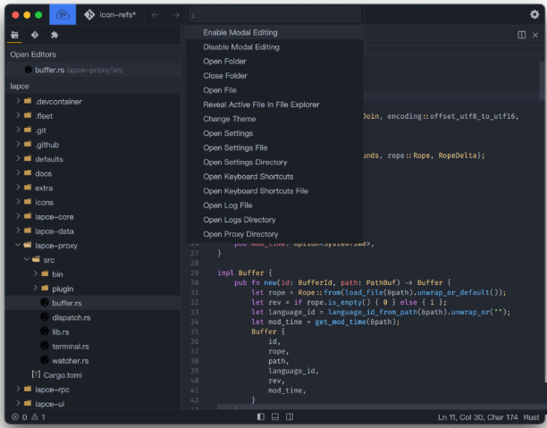 Lapce 有一个独特的功能,称为 Code Lens,它是折叠、小地图和代码大纲的混合体,代码内容以非常小的字体呈现。在 Windows 和 Linux 中通过 Ctrl + e 切换,在 macOS 中通过 Cmd + e 切换。如果启用了模态编辑,还可以使用空格键在普通模式和可视模式下切换。