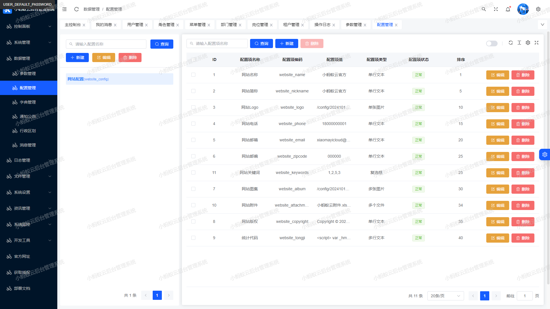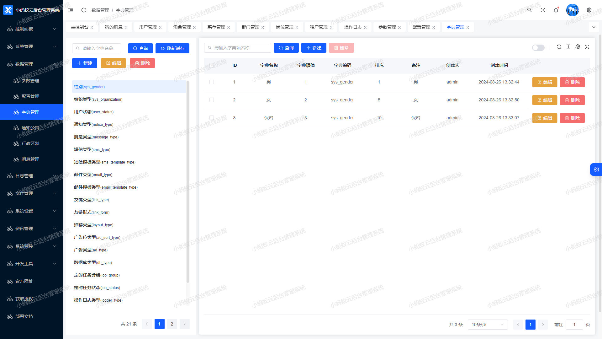 • 字典管理:用于对字典数据、字典项数据的管理为维护;