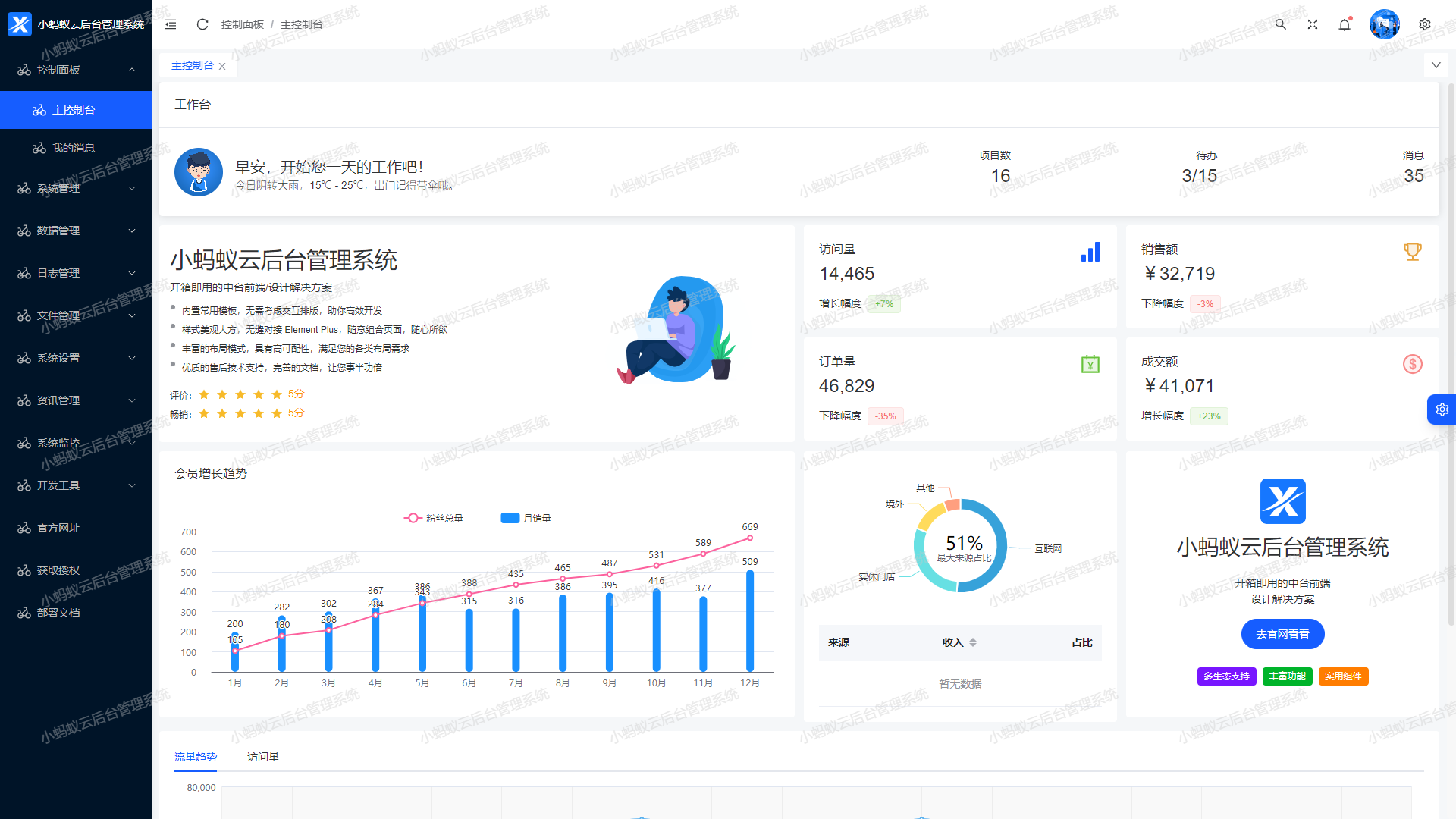 基于单体前后端分离后台管理系统;后端基于Java语言采用SpringCloud、SpringBoot3、MybatisPlus、MySQL等主流技术栈,前端基于Vue3、TypeScript、Vite等技术栈实现,采用ElementPlus前端UI框架,基于目前Vue前后端分离主流设计思想,为了实现精细化分工,模块化、组件化开发模式,目前采用完全前后端分离架构实现,前端应用通过API调用后端服务的方式实现数据交互;整套系统拥有完善的RBAC权限架构体系,权限颗粒度精细至按钮级别,支持多主题切换模式,多端兼容手机客户端、PAD平板、PC电脑等终端设备,提升了用户使用体验;同时为了简化开发,本身集成了基础模块,如用户模块、角色模块、菜单模块、部门模块、岗位模块、职级模块、日志模块、租户模块、字典模块、配置模块、行政区划、任务调度等基础功能模块; 为了支持个别企业和开发者多租户功能需求,在设计之初已重点设计并支持多租户功能;为了实现项目快速开发,官方自定义研发了整套代码生成器功能,可以根据单个规范的数据表结构一键生成模块的后端文件代码和前端模块代码;为了高度适配企业、政府和开发者定制化项目的需求,目前单体前后端分离架构发行了多个版本,根据实际需求按需选择即可,软件框架本身已集成了权限架构体系和基础功能模块,极大的提高了开发效率,降低了项目研发成本以及节省了人力。