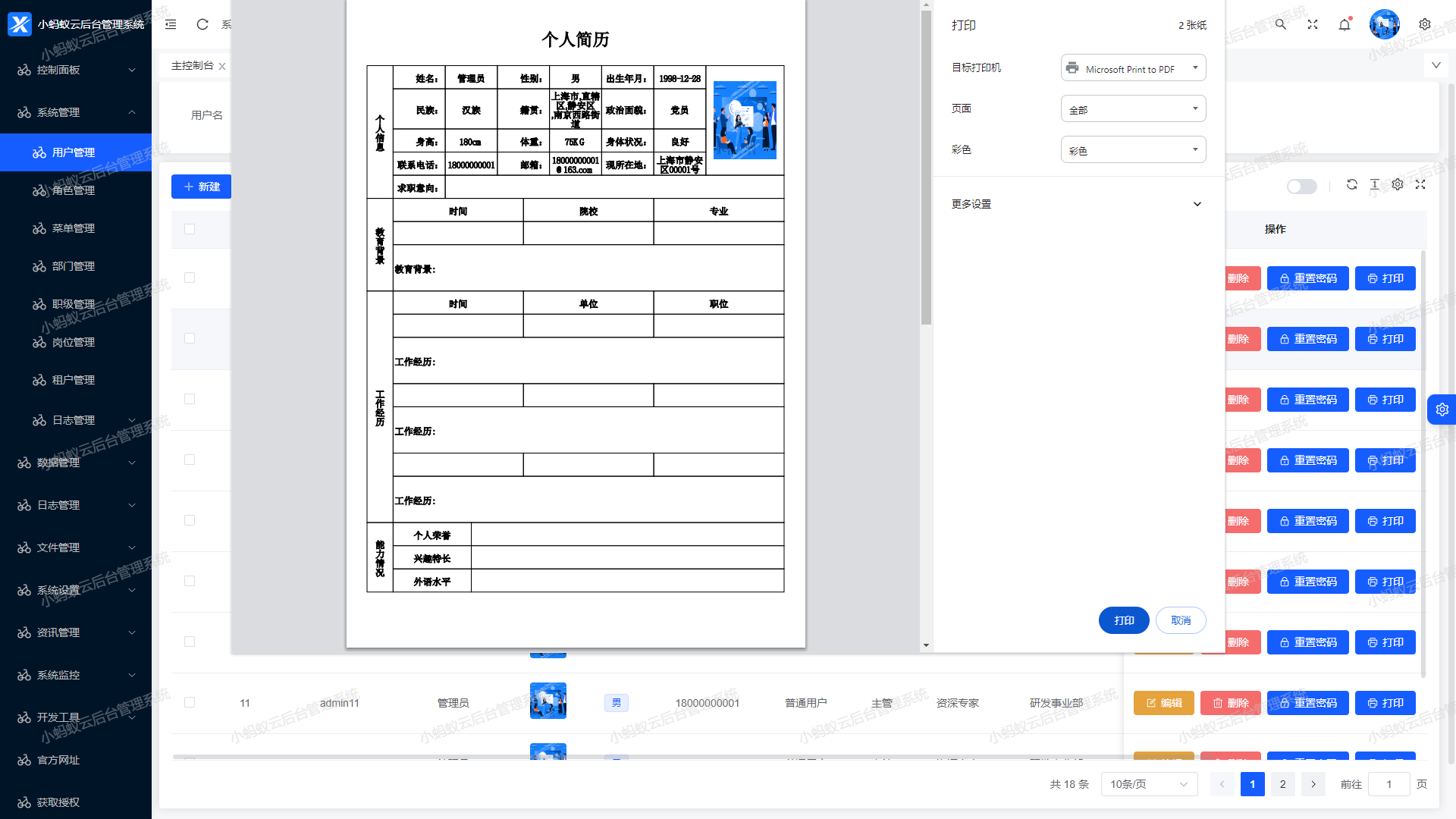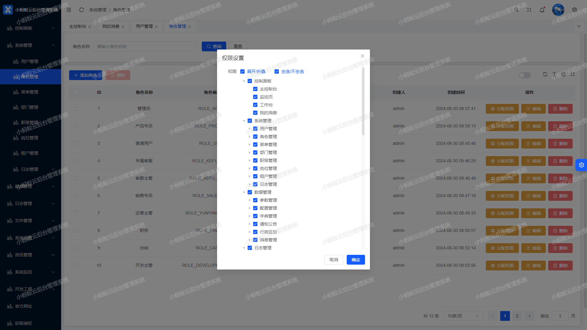 • 角色管理:基于RBAC权限架构体系,实现角色权限的管理;