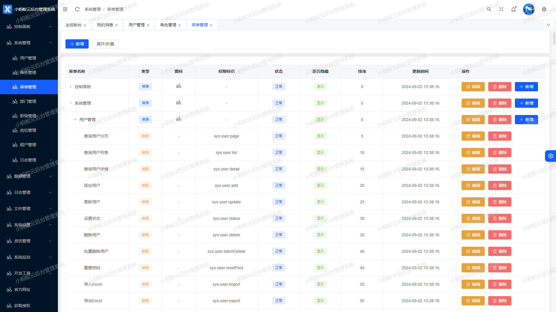 • 菜单管理:用于权限菜单数据管理以及菜单节点权限数据管理;