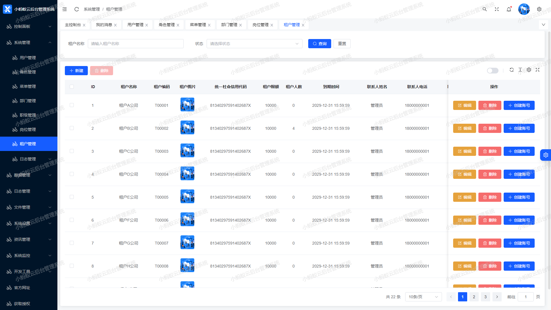 • 租户管理:主要对租户入住数据进行管理和租户账号开通管理;