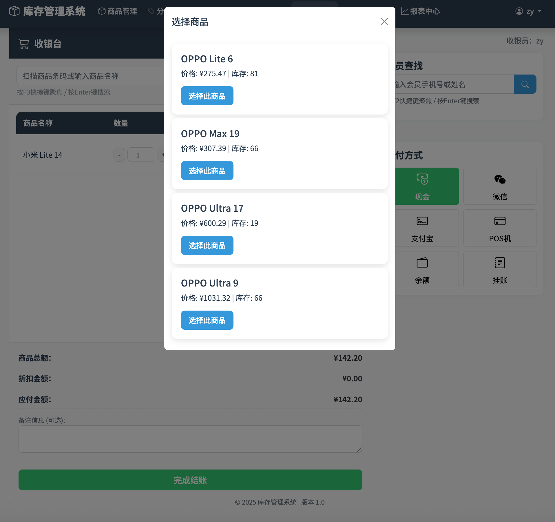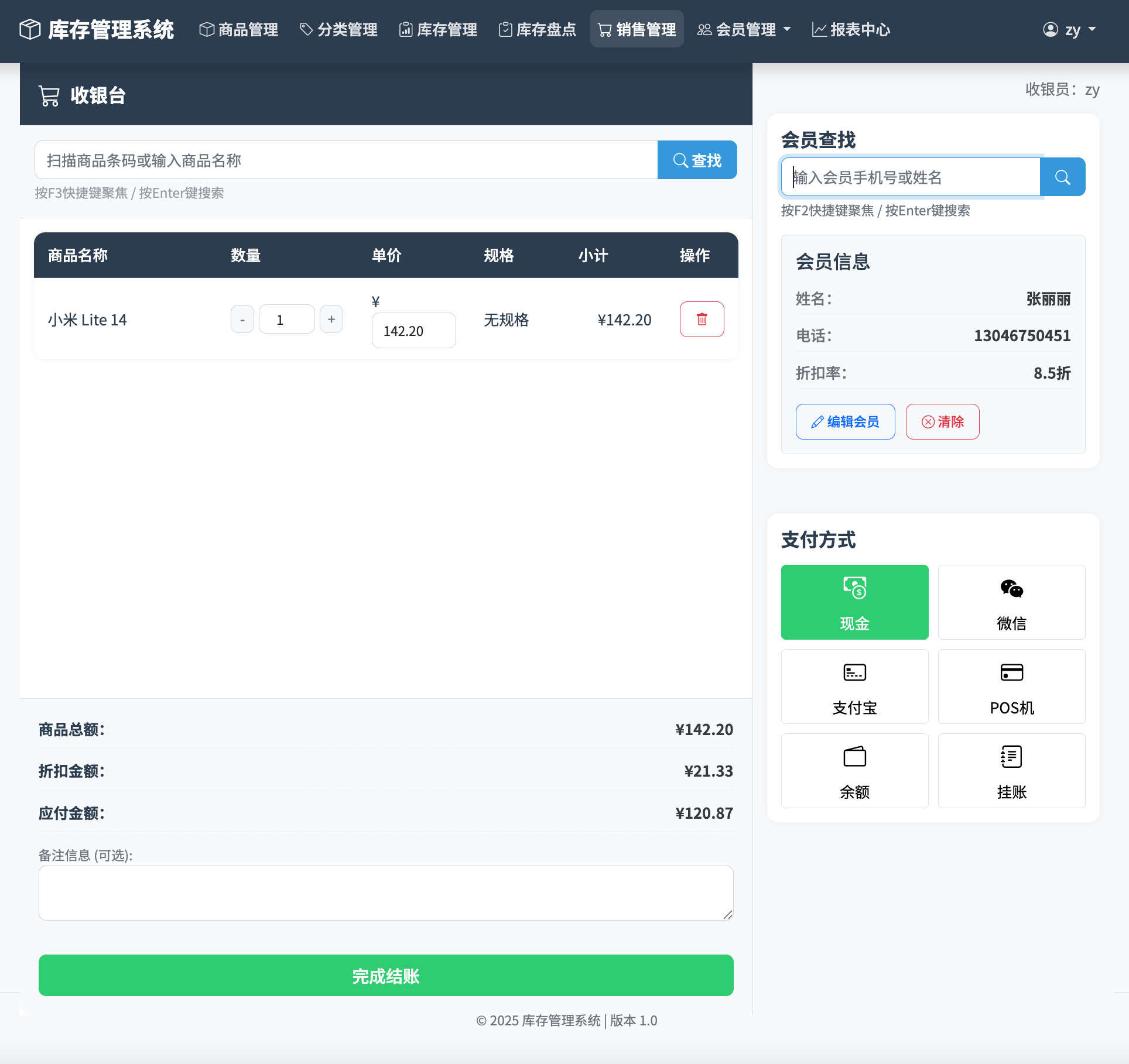 多元支付方式:集成现金、微信、支付宝、银行卡及账户余额支付。