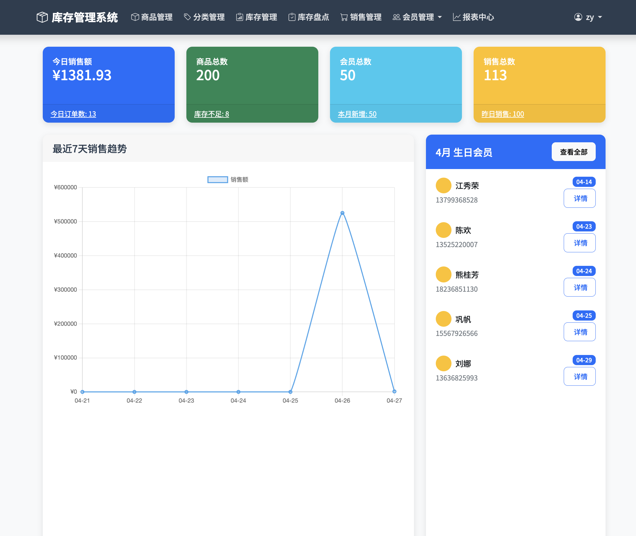 销售趋势图表:以柱状图、折线图等形式展示销售额、客流量等趋势。