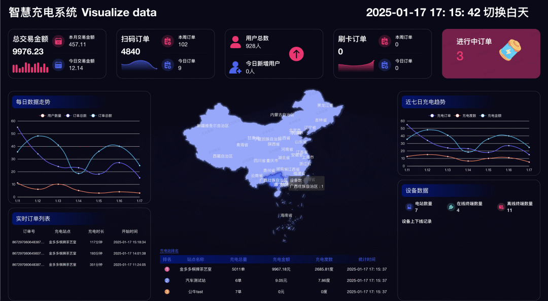 2、全面的数据洞察与管理:这部分内容分为两个方面,一是用户行为深度剖析,通过先进的数据分析系统,能够精准统计总用户数、充电人数、新增用户数,并实时跟踪动态消费信息,为运营商提供有力依据,提高用户粘性和忠诚度;二是设备状态实时掌控,系统可以对设备数量、充电端口进行精确统计,同时实时监测设备的上线/离线状态以及故障情况,有助于及时发现并解决设备问题,降低设备故障率,合理安排设备维护计划,提高设备的使用效率和寿命,确保充电服务的稳定供应。