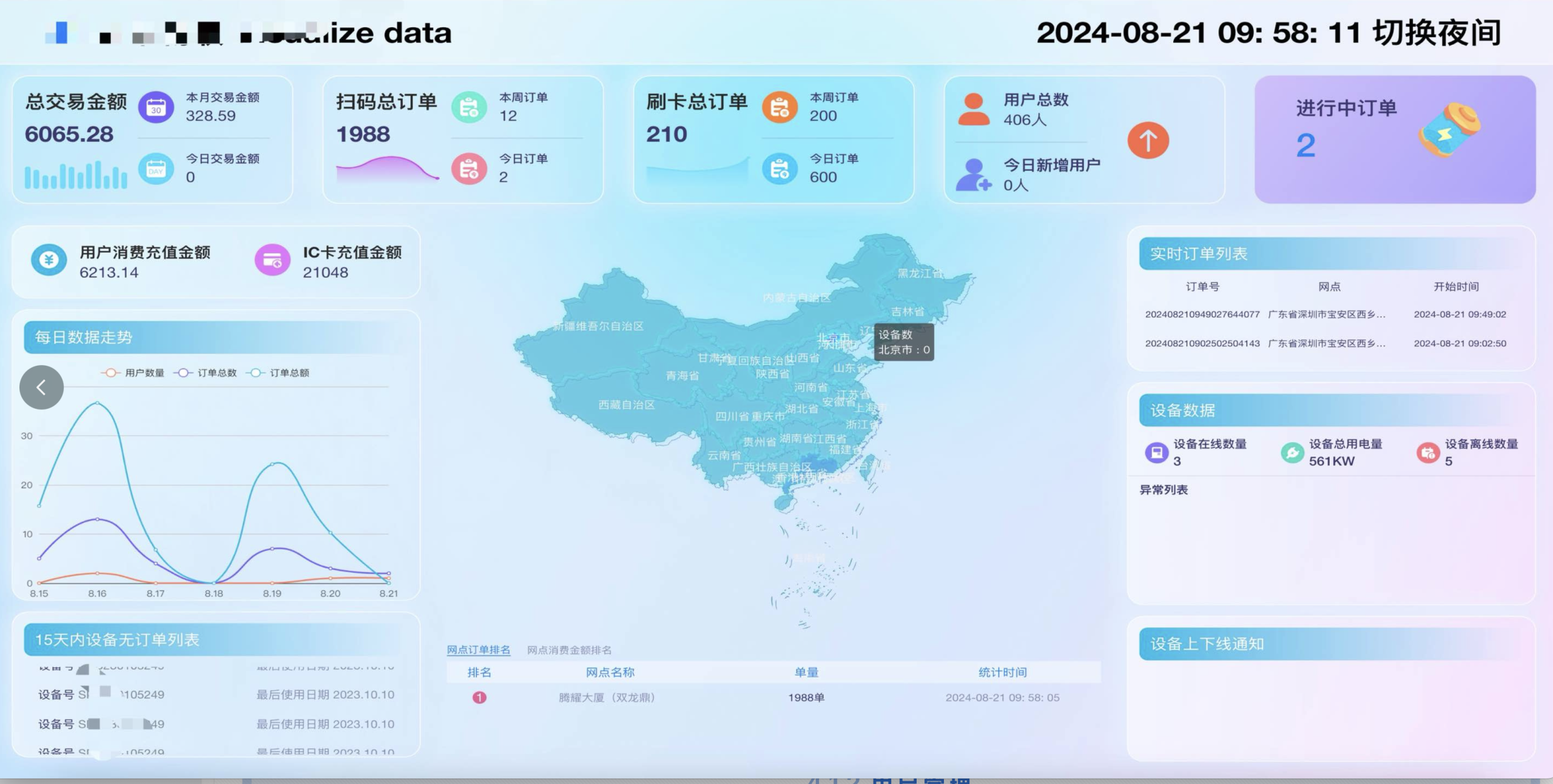 5、精准的营业数据分析:这部分内容分为两个方面,一是多维度的营业额分析,公司的营业数据统计功能涵盖了营业额统计、营业额排行、订单数统计、充值款统计以及支付类型统计等多个维度,通过这些数据,运营商可以清晰地了解业务的运营状况,及时发现业务增长的趋势和潜在问题,从而有针对性地调整运营策略,优化业务布局;二是数据驱动的决策支持,精准的营业数据分析为运营商提供了数据驱动的决策支持,帮助他们做出更明智的商业决策,例如根据营业额排行和订单数统计,合理调整设备投放位置,提高设备的利用率;根据充值款统计和支付类型统计,优化支付渠道,提升用户支付体验。