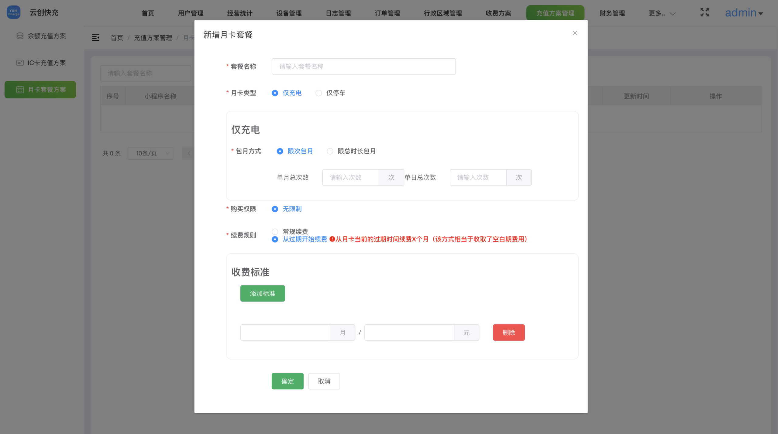 6、丰富多样的营销功能:这部分也分为两个方面,一是个性化的充电优惠活动,为了吸引更多用户使用充电桩,公司提供了丰富的营销功能,充电订单、充值订单和虚拟充值订单均可设置免费活动,同时支持充电参数的灵活设置,满足不同用户的充电需求;二是创新的月卡套餐服务,推出月卡套餐服务,用户只需购买月卡,即可在一个月内无限次使用充电桩,享受更加便捷、经济的充电服务,这种创新的营销方式不仅能够提高用户的使用频率,还能增加用户的粘性和忠诚度,为运营商带来稳定的收益。
