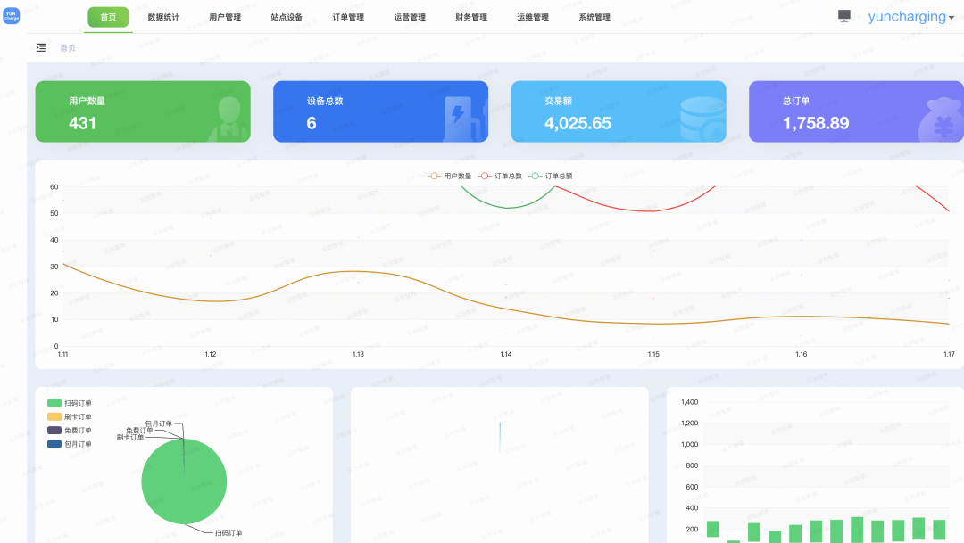 提供多维度数据报表(用户行为、订单分析、设备状态等)。