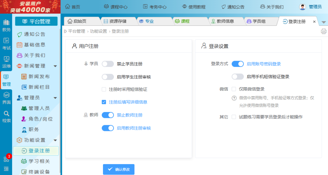 学员和讲师管理、注册审核。学员和讲师管理可管理用户注册和登录权限;注册审核能审核用户注册。