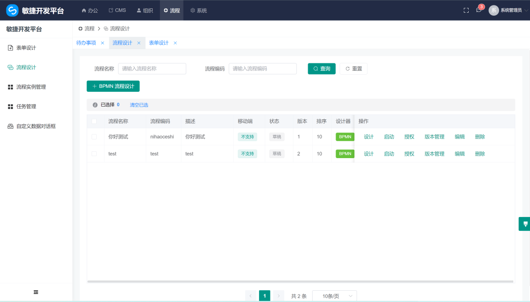 流程设计:BPMN.js 可视化设计器,支持多实例任务、并行网关、动态节点跳转。