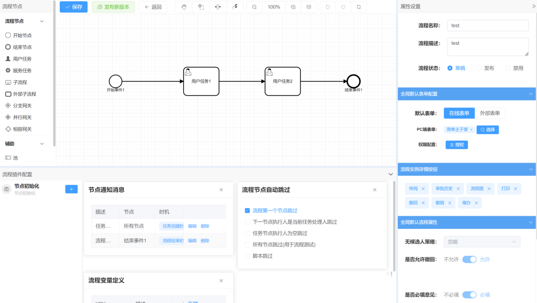 流程实例管理:实时监控流程状态(运行中/挂起/终止),支持手动干预(跳过节点/回退)。