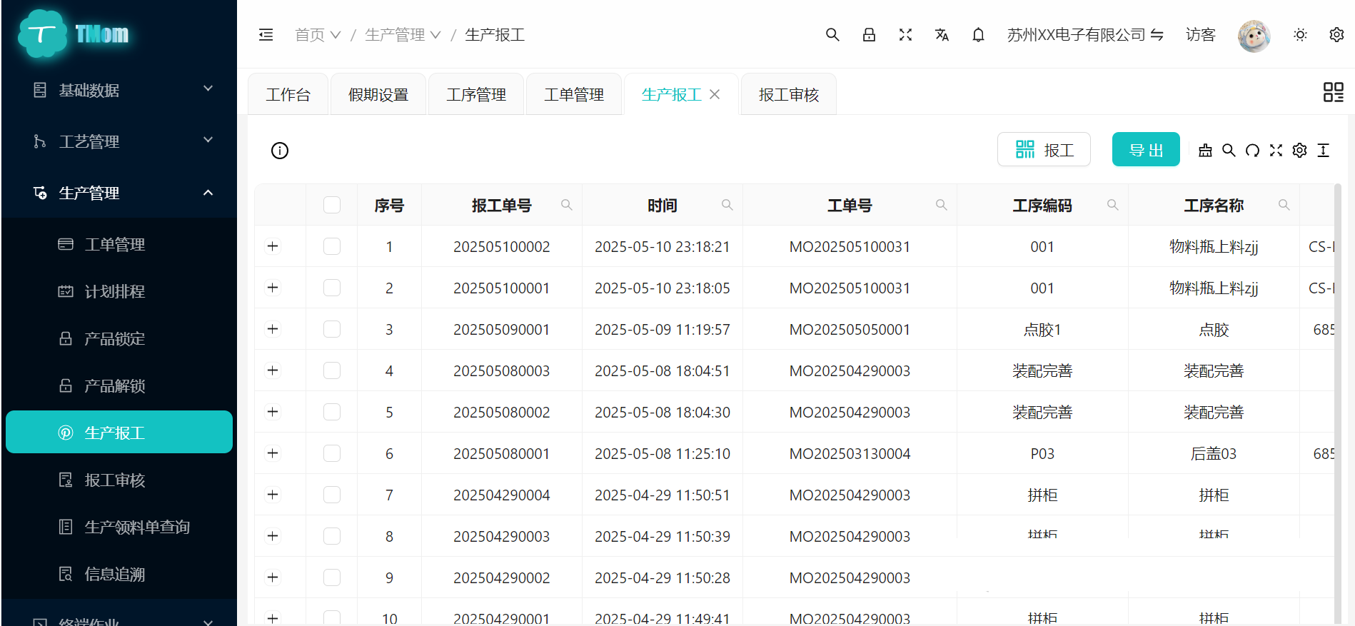 生产报工:记录和报告生产过程中各工序的实际完成情况,为生产统计和分析提供数据支持。