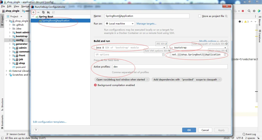 7、本地运行: 按图示新建springboot运行实例,注意只需要运行bootstrap,admin不用运行