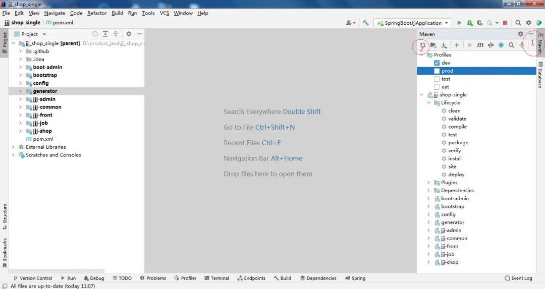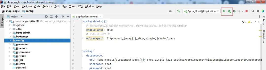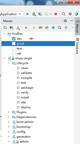 然后点击debug,或者直接运行,切记查看右边maven环境是否选择的dev