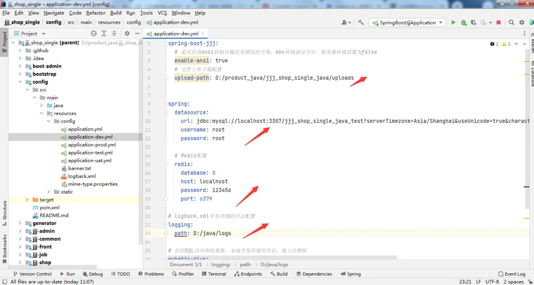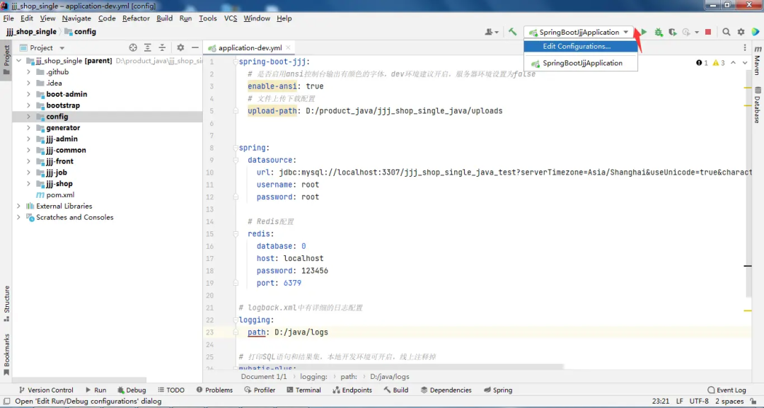6、修改配置: 如下图所示,修改开发环境配置,包括上传目录,数据库信息、redis信息、日志路径