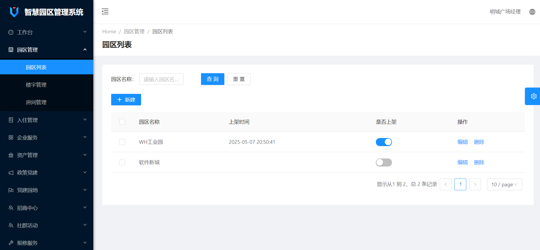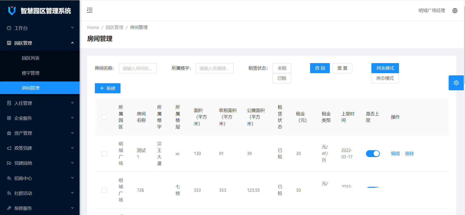 园区列表:配置园区基础信息,如总面积、房间总数、经纬度等。