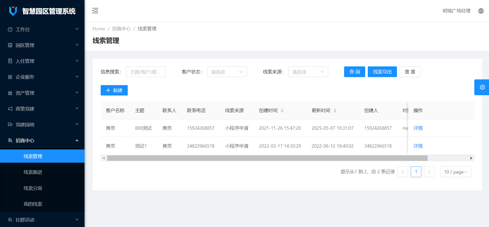 线索跟进:查看所有招商线索的跟进进度与时间安排。
