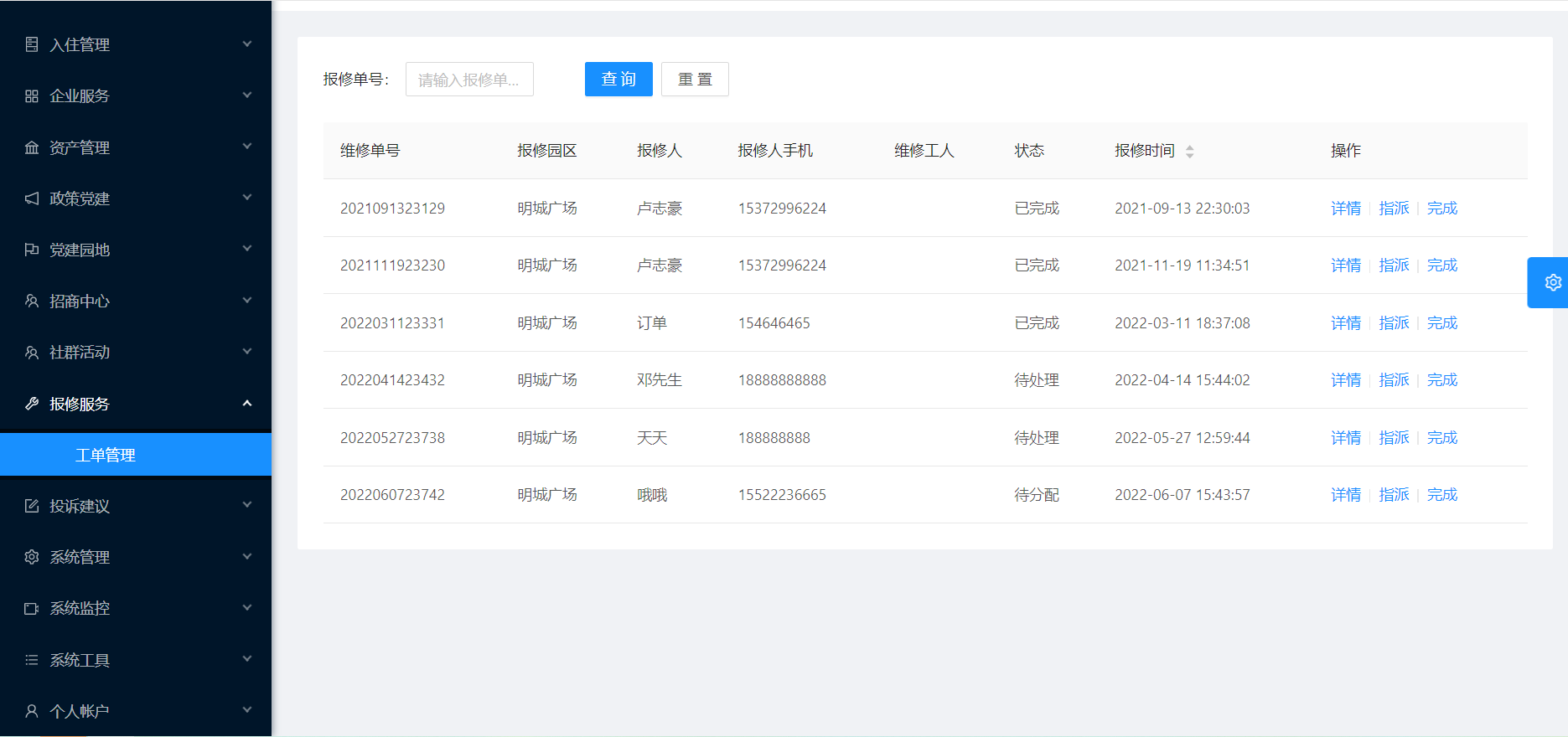 工单管理:接收小程序端提交的报修申请,统一管理维修任务,实时跟踪处理进度。