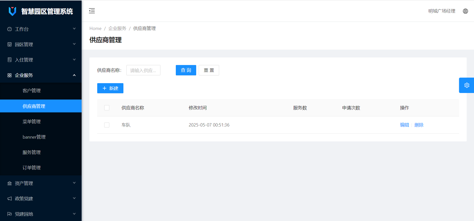 服务管理:管理园区活动发布,配合菜单与供应商模块使用。