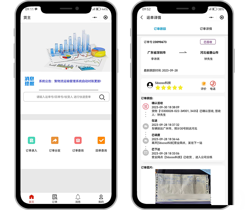 货主手机下单、查单、跟踪订单实时状态、确认账单、发票申请等操作,全程实现移动端处理业务,随时随地实时监控订单的动态节点信息,为货主提供全方位的物流服务。