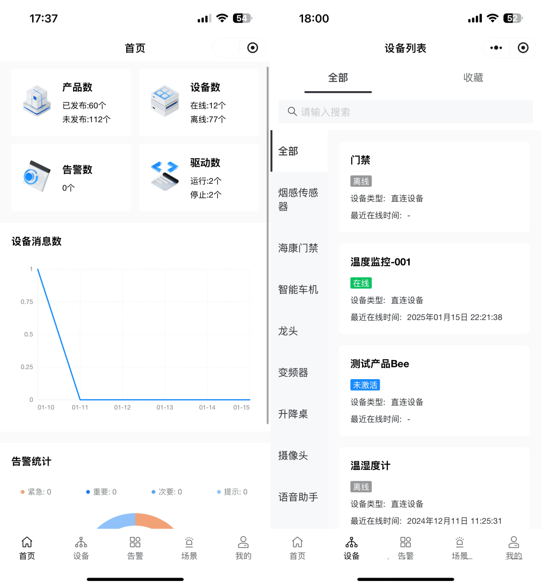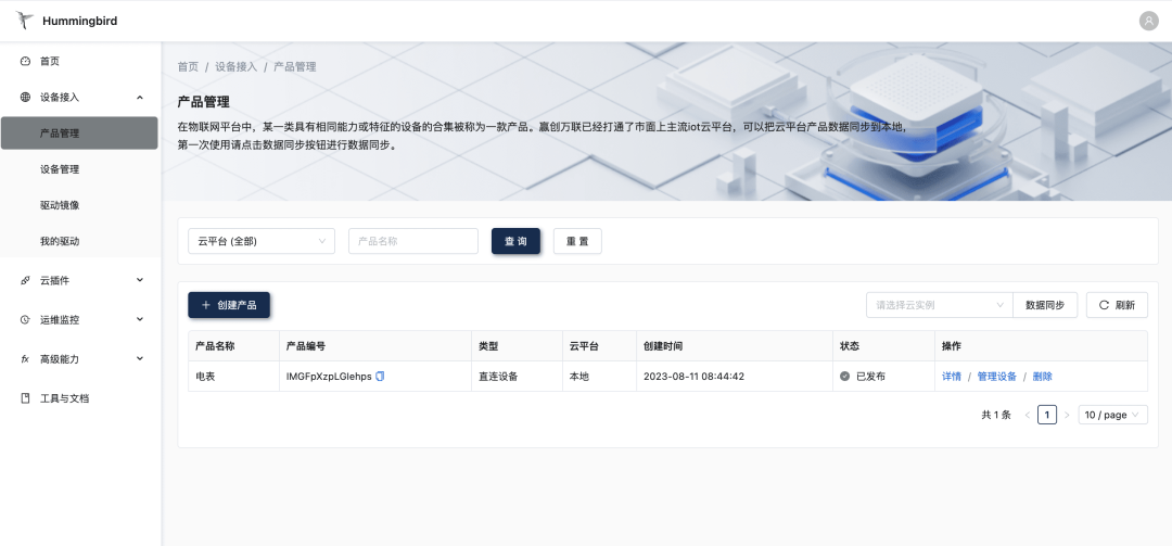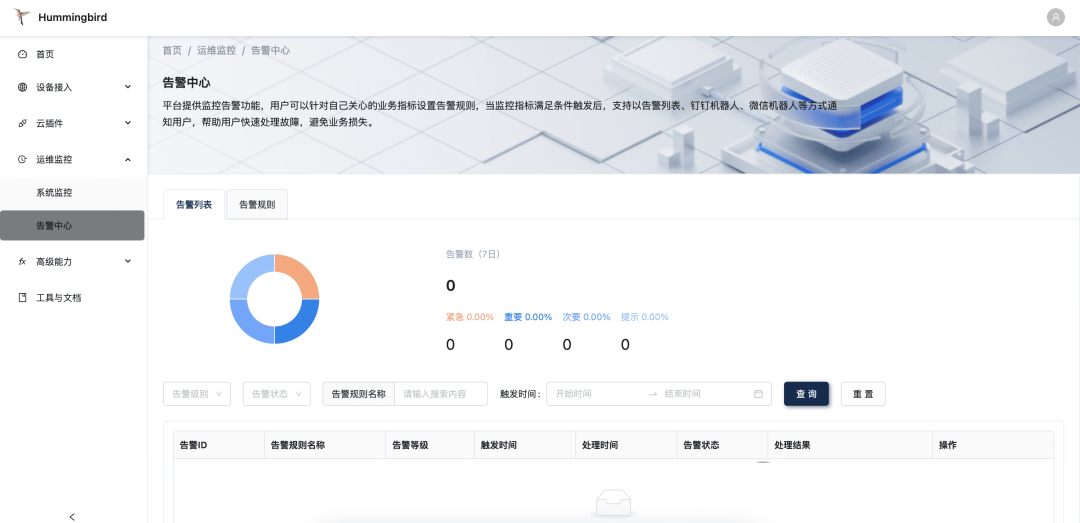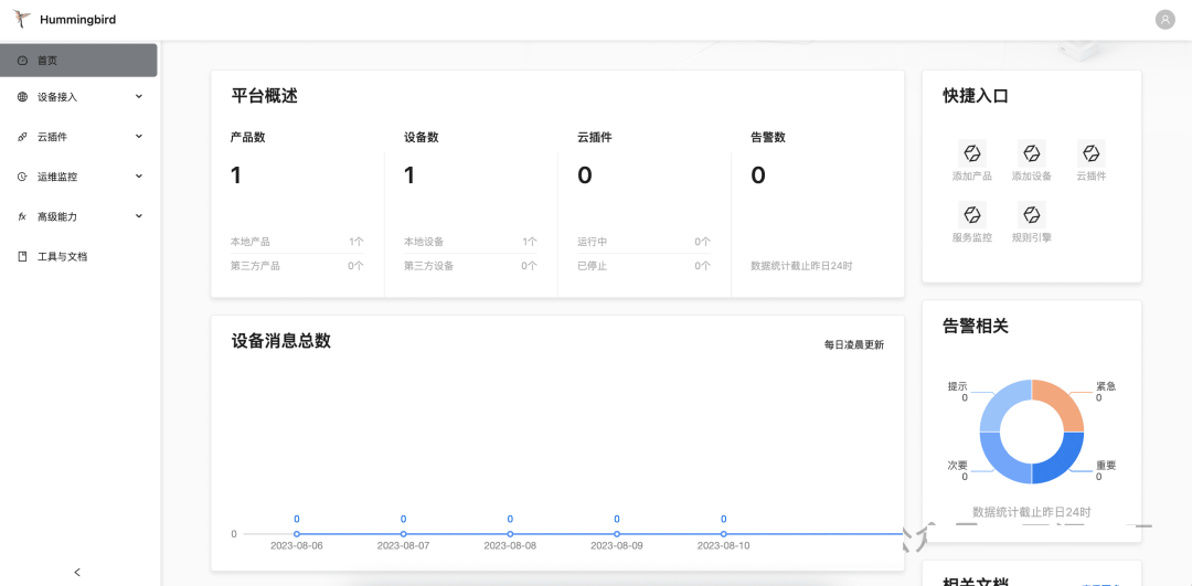 “麻雀虽小,五脏俱全”,虽为超轻量级物联网平台,其核心功能却一应俱全。设备接入、产品管理、物模型、告警中心、规则引擎等物联网平台的标准功能,在蜂鸟平台中均可找到。